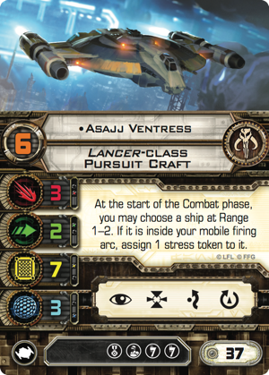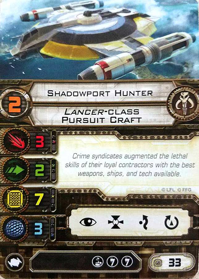 Esta nave, la Lancer-class Pursuit, es una nave muy completa; 10 vidas (3 escudos), 2 dados de defensa y 3 de ataque.