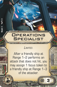 El especialista nos permite dar ojos a las demás naves, favoreciendo su ataque en la fase de combate. No obstante, si se prefiere, se puede poner a un agente del servicio de inteligencia + Fuselaje ultraligero, que nos permitirá tener una nave que dure algo más en mesa y una referencia para las naves, por si les conviene tonelear para conseguir el tan ansiado rango.